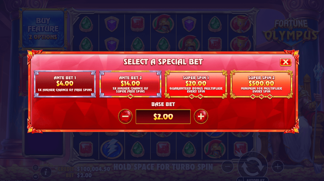In addition to the standard gameplay, Fortune of Olympus offers optional special bets that allow players to increase volatility, guarantee multiplier activity, or improve the chances of triggering the bonus. For those who prefer immediate access, the bonus can also be activated directly through dedicated buy options.