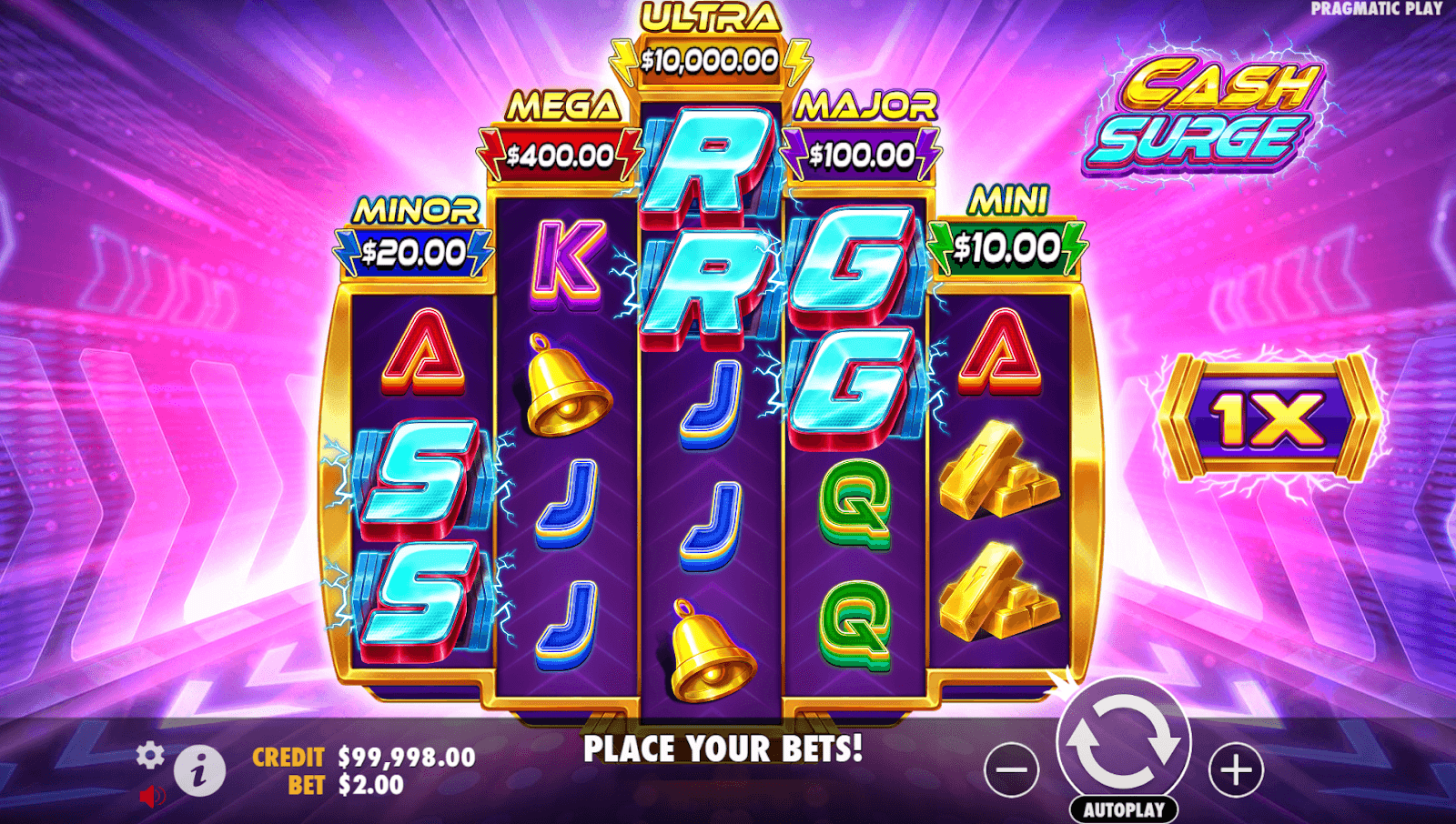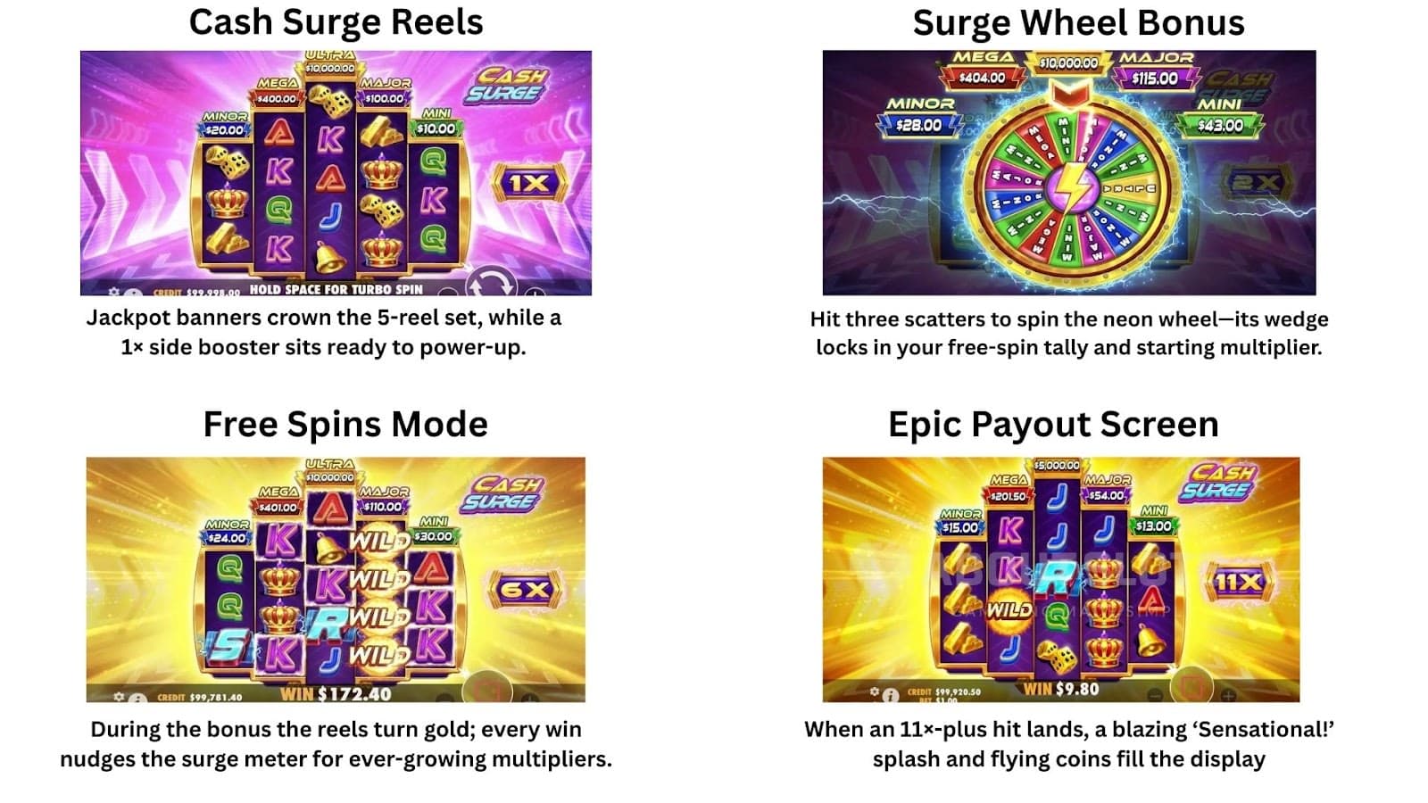 کیش سرج، تخلیق کردہ عملی کھیل، 3-4-5-4-3 ڈائمنڈ گرڈ پر کلاسک ریل پروگریسیوز کو جدید بجلی کے میکانکس کے ساتھ فیوز کرتا ہے جو 720 باتھ وے راستے پیش کرتا ہے۔ یہ 96.52٪ آر ٹی پی پر چلتا ہے جس میں اعلی اتار چڑھاؤ اور ڈاک €0.20 سے €240 تک ہے۔ پانچ ترقی پسند کیش انعامات ریلز کے اوپر بیٹھتے ہیں، جب بھی بجلی کی علامتیں اترتی ہیں تو 0.5 × بجلی بونس وہیل کو بھی گھما سکتی ہے جو فوری طور پر منسلک انعام دیتا ہے۔ کسی پیش شرط یا فیچر بائی کے بغیر، حکمت عملی فری اسپن کو متحرک کرنے سے پہلے ان ریل انعامات کی پرورش کے گرد گھومتی ہے۔